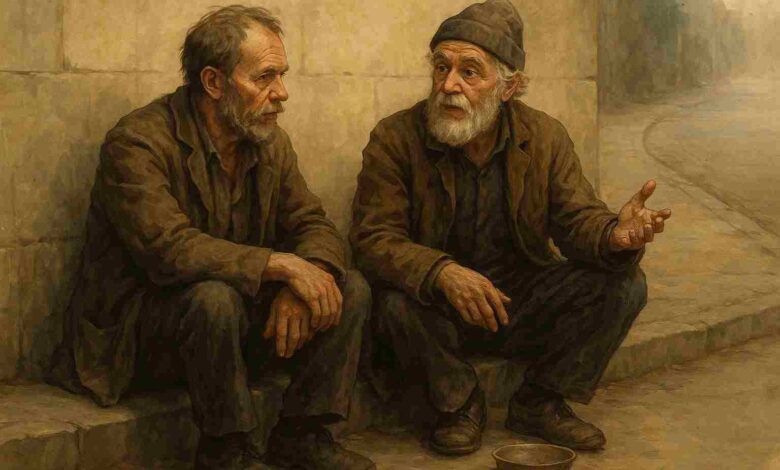 في وقت استراحة شحادين عند حافة الطريق سأل الأول الثاني لماذا هو فخور بنفسه اليوم وكبرياءه عال ويتحدث ويتصرّف بثقة عميقة في النفس كرجل عالم و وقور عكس السنوات السابقة المريرة،أجابه: