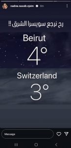 وقامت نادين بمقارنة الحرارة بين بيروت وسويسرا، فقد سجّلت في البلد الأوروبيّ 3 درجات، وقالت تعليقاً على هذا الأمر: “رح نرجع سويسرا الشرق”.