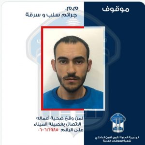 لذلك، وبناء على إشارة القضاء المختص، تعمم المديرية العامة لقوى الأمن الداخلي صورته، وتطلب من الذين وقعوا ضحية أعماله وتعرفوا إليه، الحضور إلى مركز فصيلة الميناء أو الاتصال على الرقم 616985-06 “.